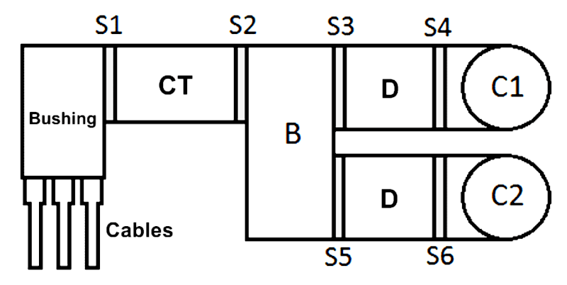 모니터링 가스 절연부는 전류 변성기 (CT)와, 차단기 (B), 및 상기 버스 부분(C1-C2)의 교환을 위한 두 분리기(D)로 측정된 케이블 종단에 이루어진다. 여섯 개의 센서(S1-S6)는 GIS 절연 상태 모니터링, 결함의 위치뿐만 아니라, HV 케이블 절연 상태 모니터링을 제공한다.